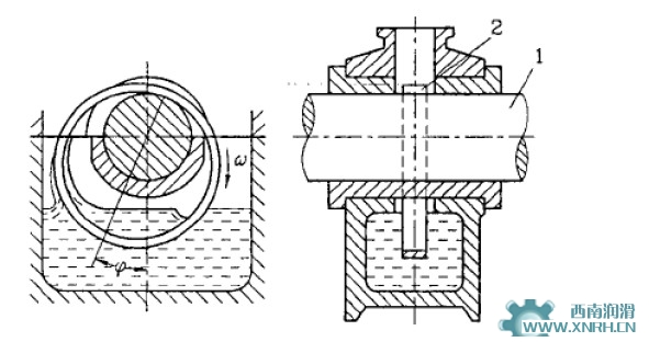 如图所示,套在轴1上的油环2下部在油池中,当轴旋转时,靠摩擦力带动油环转动,从而把油带入轴承中进行润滑。