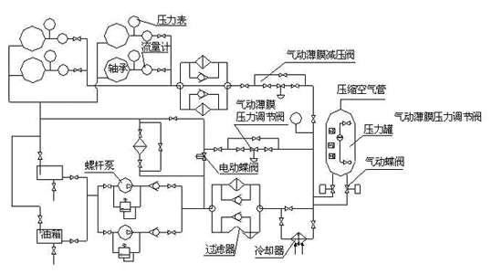 (2)采用2台螺杆泵供油,系统设置安全阀,供油口采用金属网过滤和板式冷却器冷却,系统回油口采用磁过滤器过滤。对润滑油的压力、温度、流量的控制范围较宽,不能满足油膜轴承的运行要求。