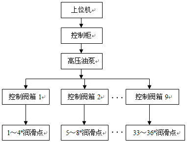 控制柜首先启动高压油泵,将油脂输送到主油管,随后控制柜打开第一个润滑点电磁开关,向该油点供油,即从高压油泵至第一个润滑点形成一个输油通路,此时其他润滑点电磁开关均关闭,油泵压力全部集中在此润滑点,确保该点供油压力。当第一个润滑点供油结束,控制柜关闭其电池开关,同时打开第二个润滑点电磁开关,向其供油,供油过程和第一个润滑点相同,以此类推,系统对所有润滑点逐点供油。当最后一个润滑点供油结束,系统进入循环时间后,系统自启动,周而复始,实现对中速磨煤机系统的智能化供油。
