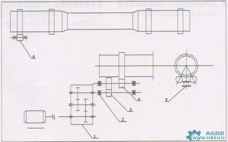 1.齿箱;2.传动轴承;3.传动齿轮;4.开始齿轮;5.挡轮瓦;6.托轮瓦