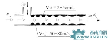 由于生产设备实现了流水作业,多台机器有机地联系在一起,形成一个整体——生产线。整条生产线上,润滑点很多,各润滑点对油品的要求也不尽相同。可喜的是,润滑油品实现了高性能化、低粘化、通用化,使供油方式得以实现多点集中润滑。近些年,供油方式发展了油气润滑和喷射润滑。油气润滑的原理,如图1 所示。在油气润滑系统中,定时、定量间断地供给润滑油品,用压缩空气,沿油管内壁将油吹向润滑点,将油品准确地供应到最需要的润滑部位。