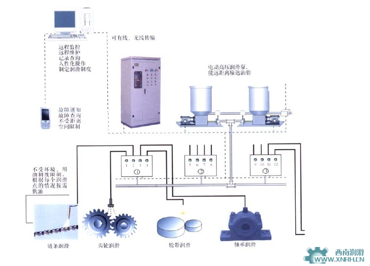 由于油泵输出的油品,一直在管路中运行,在油品输送过程中,油品不与环境介质接触,保证了油品的清洁度和高性能,使用这种润滑方式避免了环境干扰,更适用于高速、重载、高温工况,以及易受赃物、水和化学性流体侵蚀的场合。由于采用程序控制或智能控制,一个供油系统,可以供几十个甚至上百个润滑点,并可保证对每个润滑点按时供给必要量的油品。